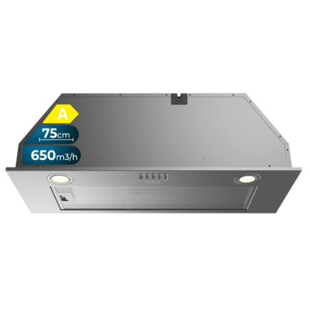Bolero Flux IM 756500 Inox A Campana integral de 75cm de ancho, acabado inox, potencia succión 650m3/h, Motor 165W, Clase A, control mecánico, 3 niveles de potencia, Luz y filtro de carbono.